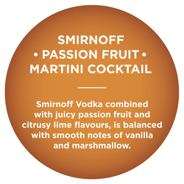 Smirnoff Vodka combined with juicy passion fruit and citrusy lime flavours, is balanced with smooth notes of vanilla and marshmallow.