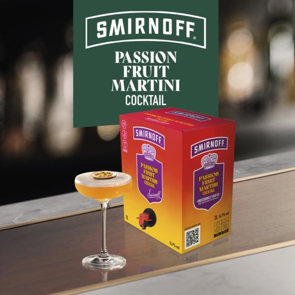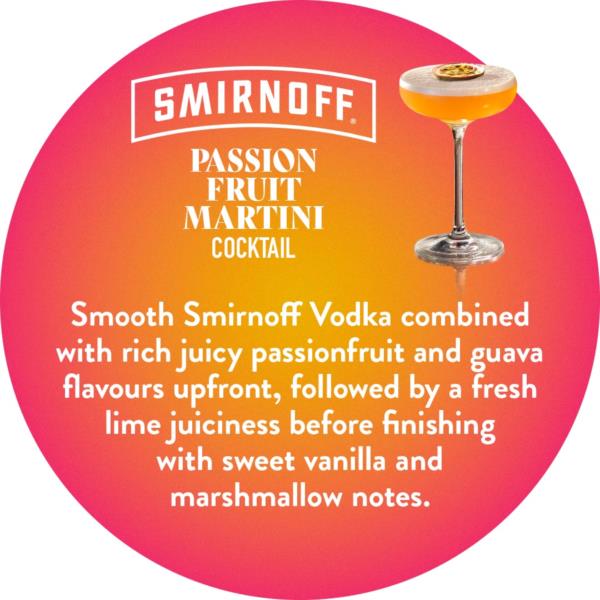 Introducing the professionally crafted pre-batched Smirnoff Passionfruit Martini cocktail. The nation s favourite cocktail, created using Smirnoff Vodka combined with juicy passion fruit and citrusy lime flavours, balanced with smooth notes of vanilla and marshmallow. Now readily available in an easily decanted format to help with quick service, highvolume cocktail orders. Simply pour 150ml into a cocktail shaker over ice, shake for 10 seconds and strain into a chilled martini/coupe glass. Garnish with half a passionfruit.